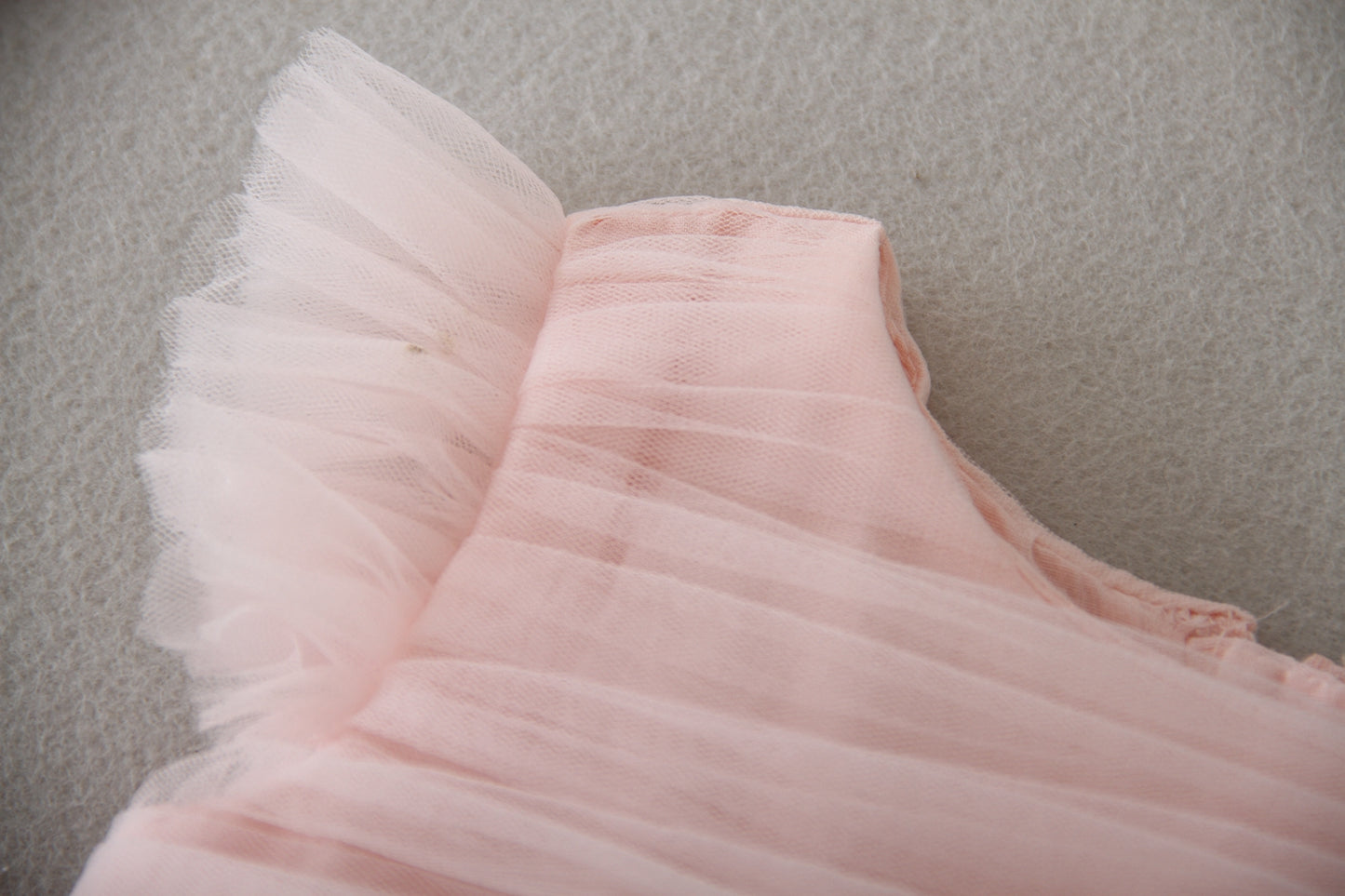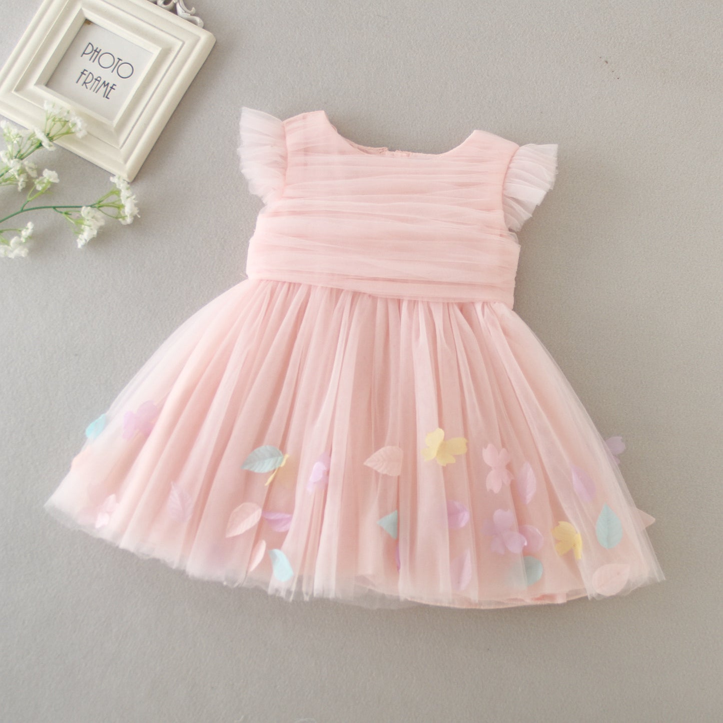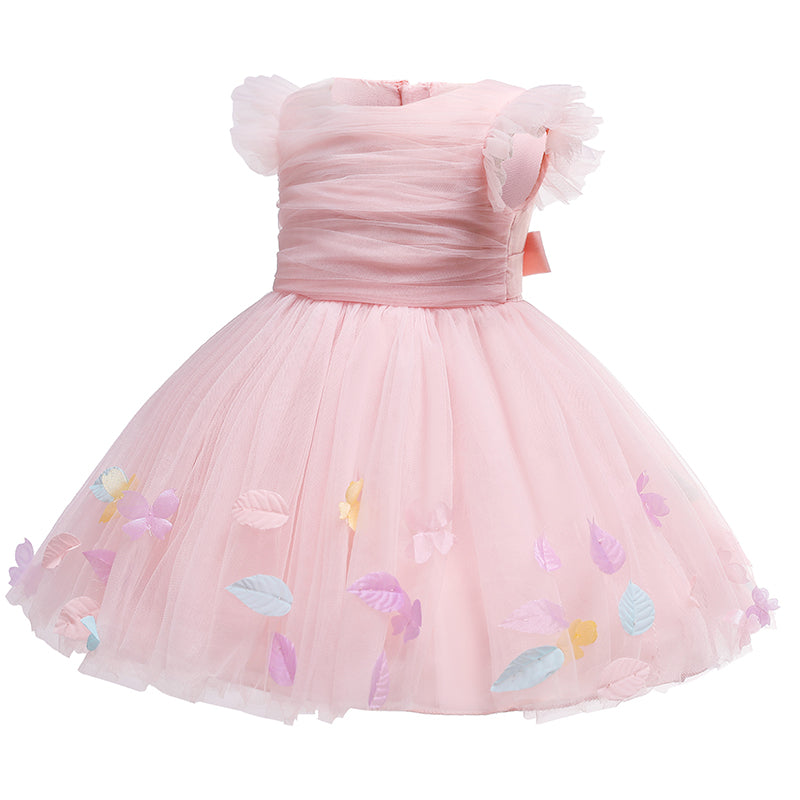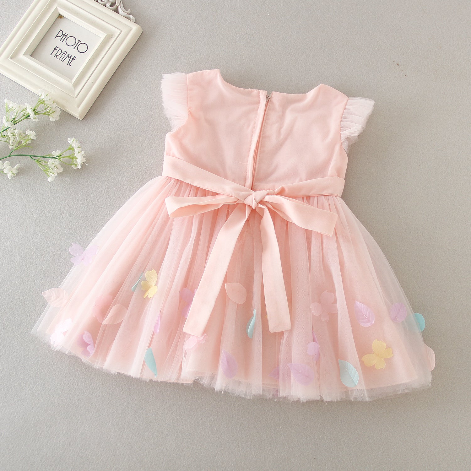Baptism dress in pink or as Party wear for Toddler girls or Baby Flower girl dress - Soft Pastel shades of butterflies with ruffled sleeves and leaves on the bottom of the baby pink net dress in soft, breathable fabric for your little baby toddler girl boutique clothing online.