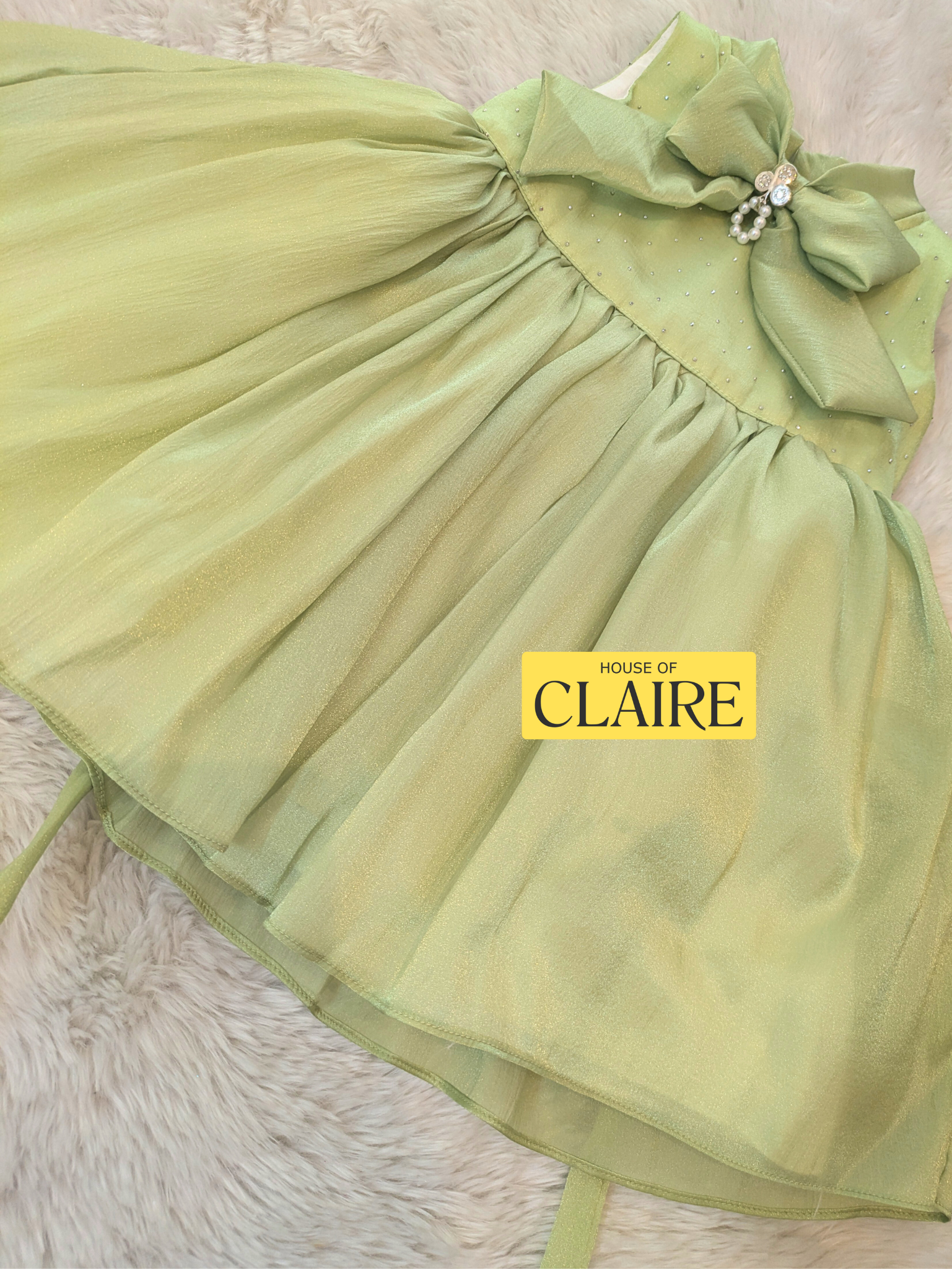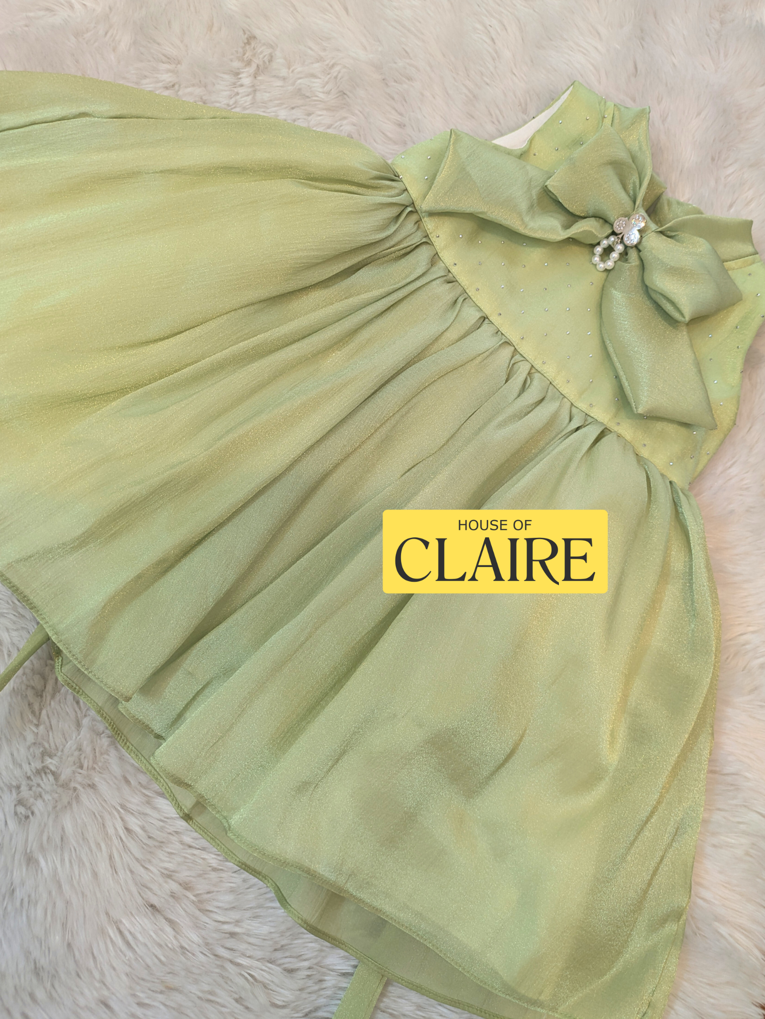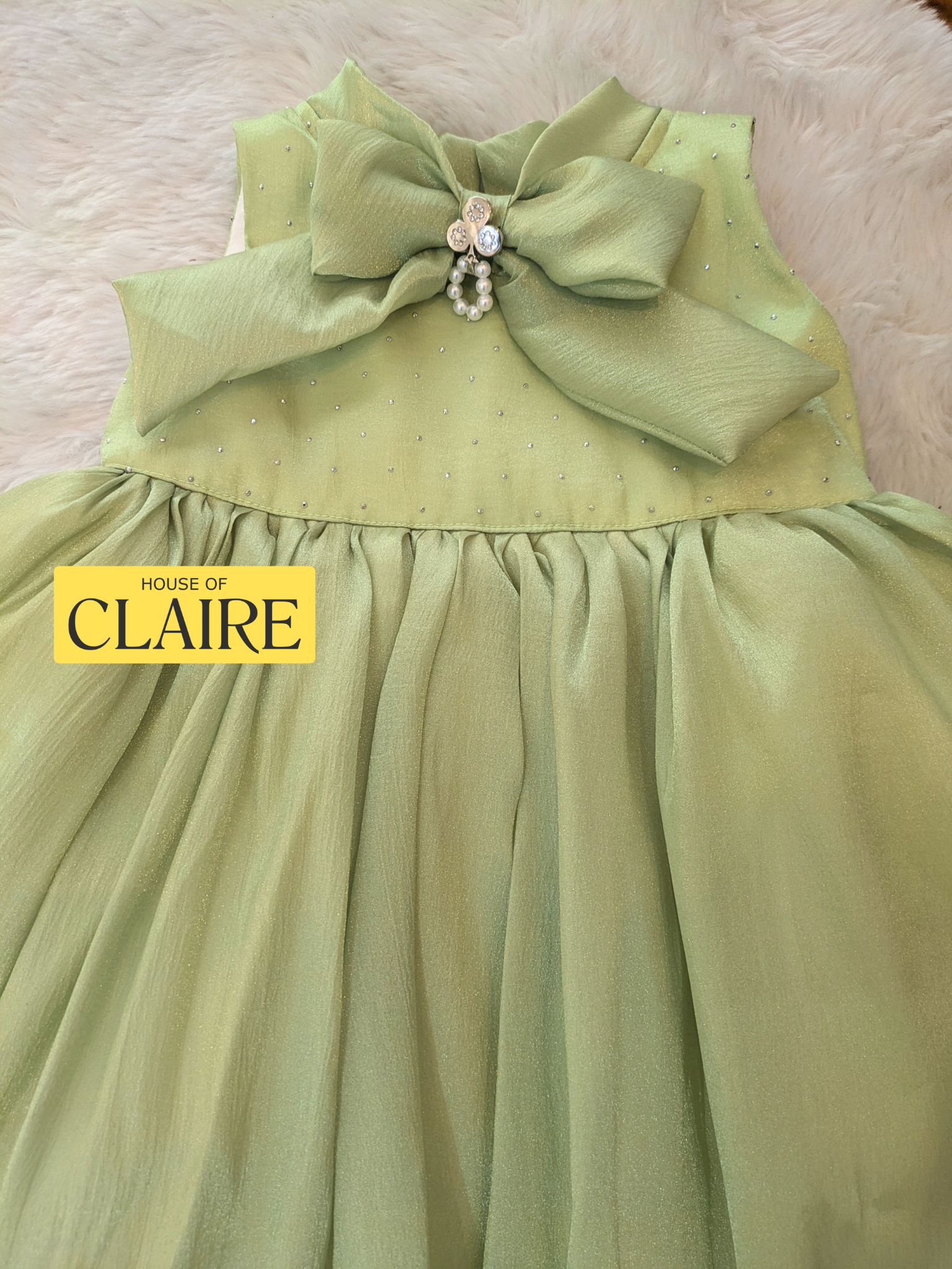 The sleeveless frock features a luxurious flare skirt paired with a statement bow in matching pastel mint adorned with pearl and crystal embellishments. The delicately shimmer-dotted bodice adds a subtle sparkle, ensuring your little one looks picture-perfect at every occasion.